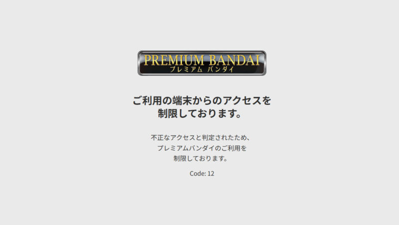 朝からプレミアムバンダイにアクセスすると「ご利用の端末からのアクセスを制限しております。」の文字。